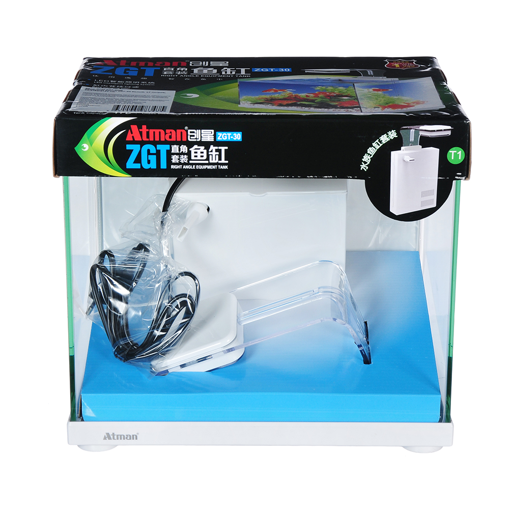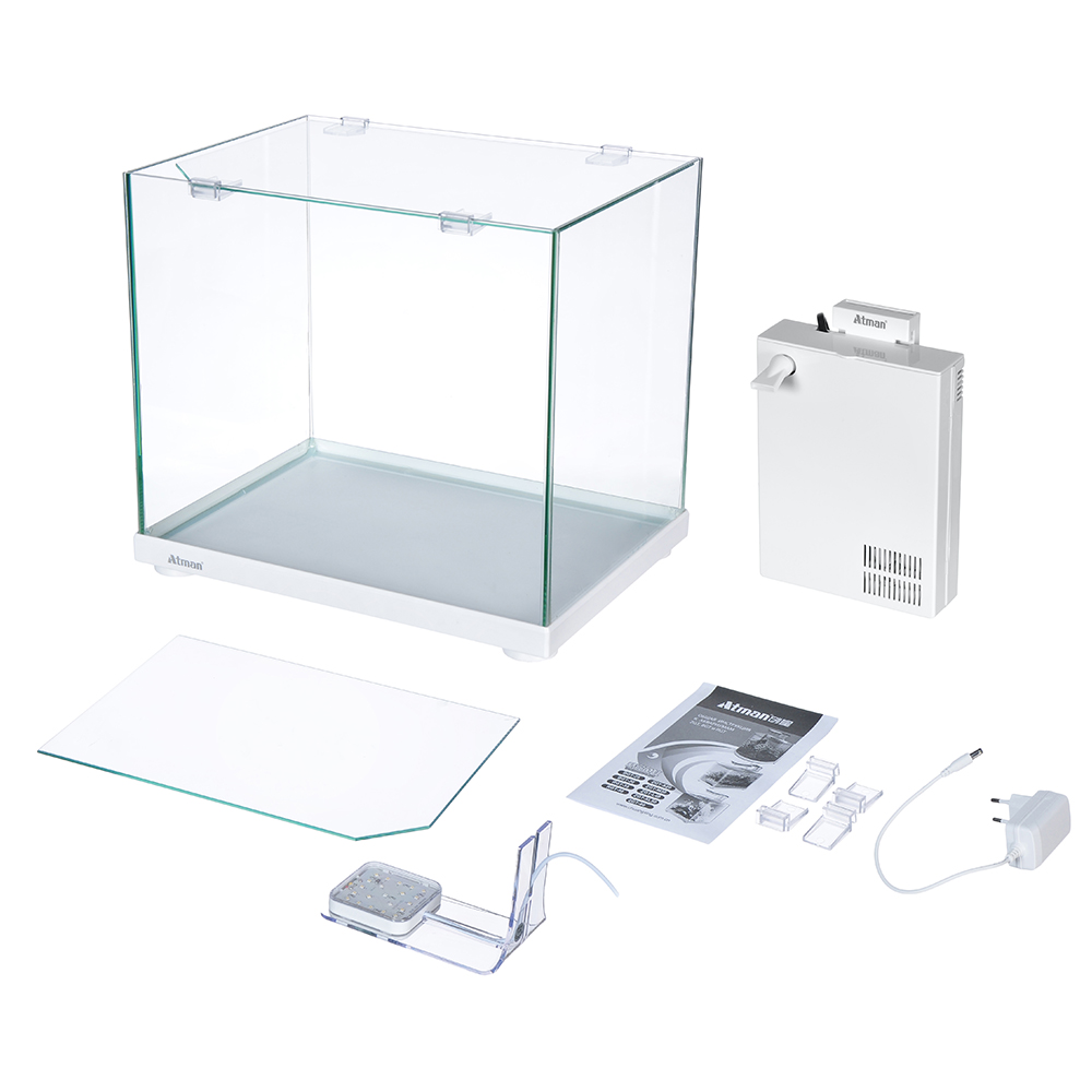 В комплекте аквариума вы найдете: покровное стекло с держателями, удобный внутренний фильтр Atman SP-200 (200л/ч), который крепится на заднюю стенку аквариума и светодиодный светильник CX-SP (5,6W).