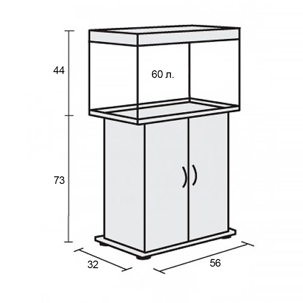 Тумба под аквариум имеет размеры 56x32x74 см (ДхШхВ), а ниша для оборудования – 41,6×23,9×67,4 см (ДхШхВ).