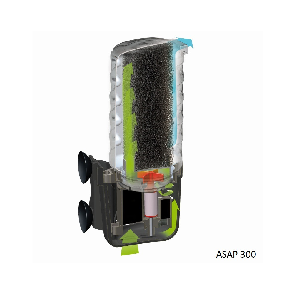 Внутренний фильтр Aquael ASAP 300 состоит из современного энергоэффективного мотора, который помещен в элегантный кожух. В большой прозрачной емкости расположена фильтрующая губка, которая посредством не только механической, но и биологической фильтрации гарантирует супер прозрачную воду, все это осуществляться благодаря тому что, специальная губка быстро заселяется полезными бактериями.
